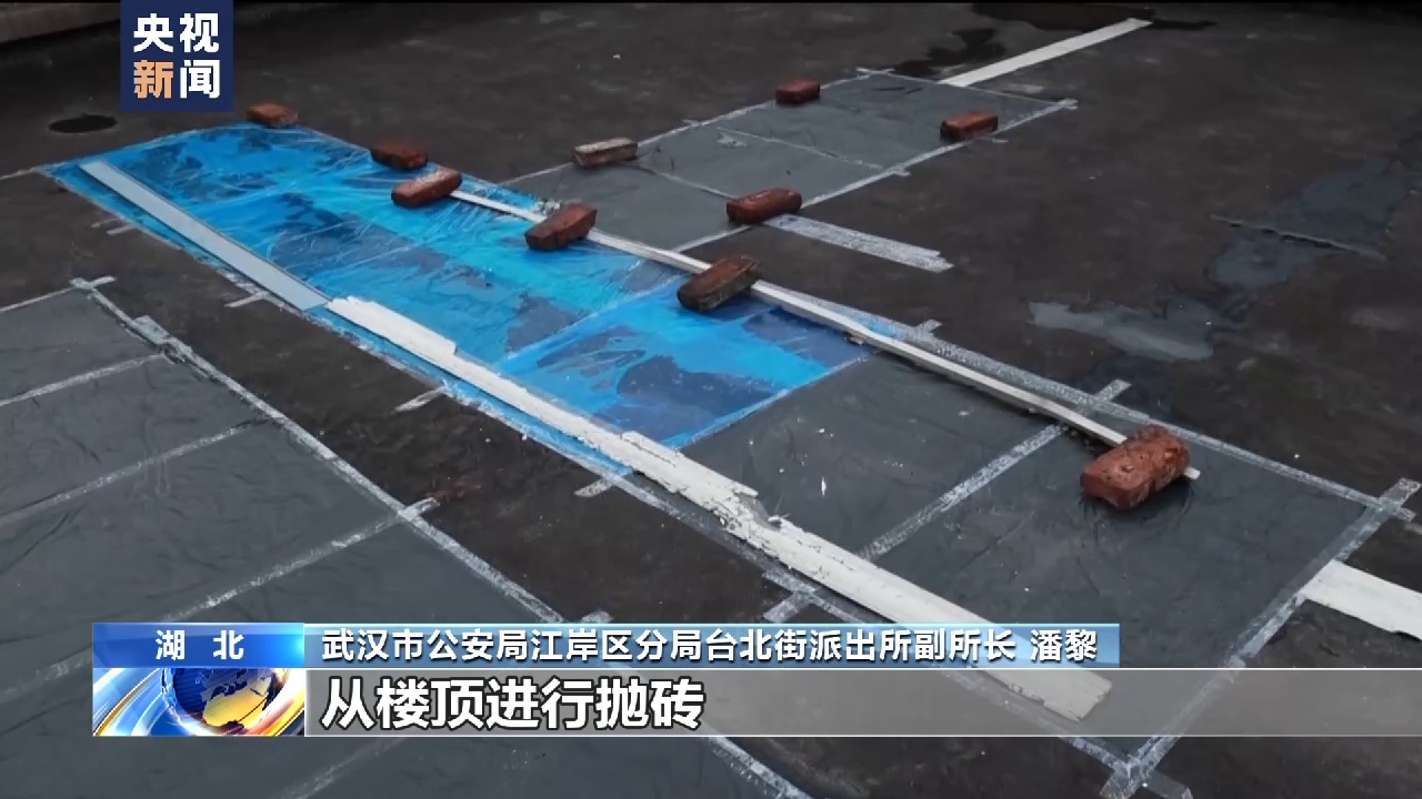 武汉市公安局江岸区分局台北街派出所副所长 潘黎:初步判定旁边有一栋楼是高空抛物具体的位置,当时我们就到楼上顶层进行现场查勘。发现楼上有三块砖的痕迹,应该是嫌疑人从这个地方就地取材,从楼顶进行抛砖。