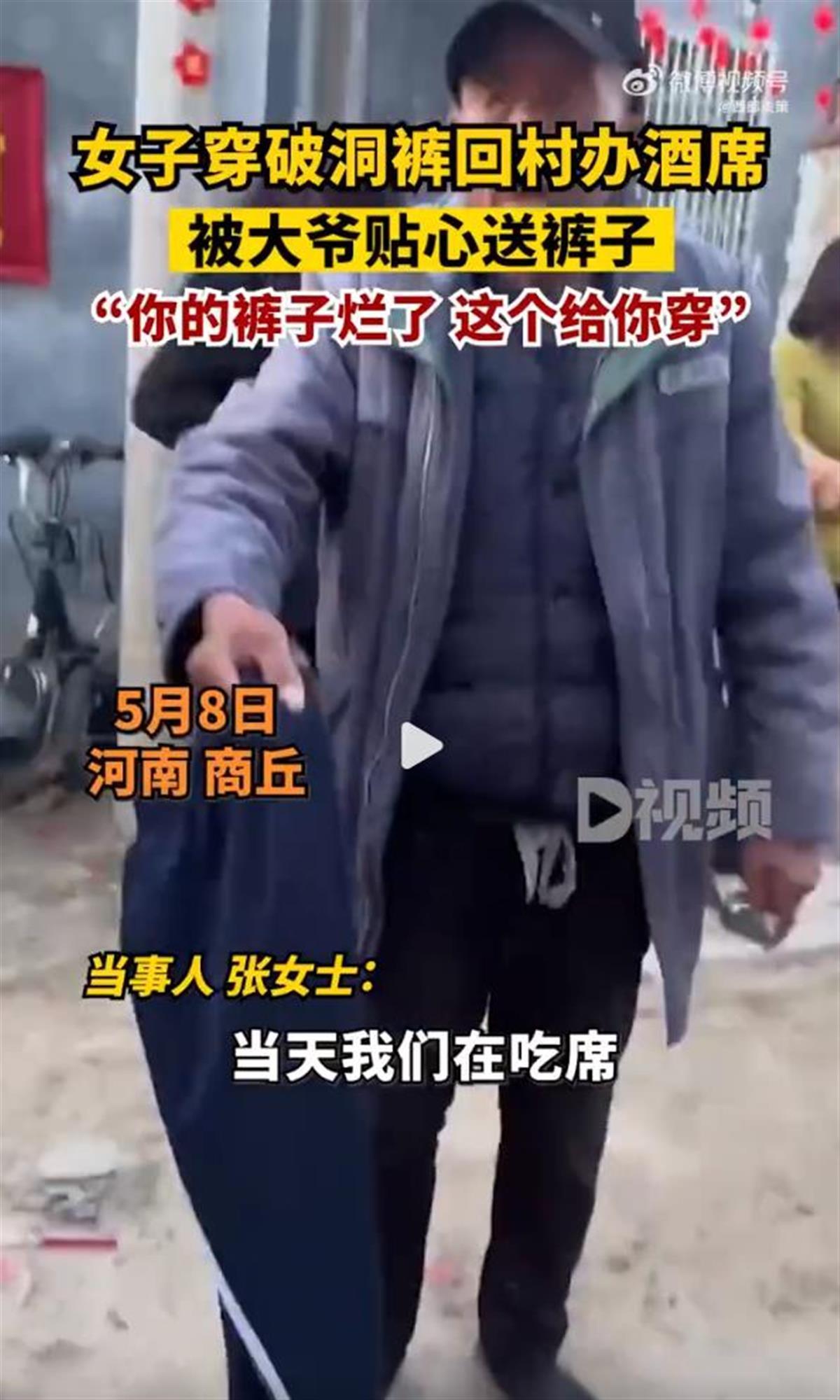 近日,一段网络流传的视频显示,河南商丘张女士9号举行婚礼,提前一天在村里办酒席,当天张女士穿了一条破洞裤,被村里一位大爷看到,大爷饭都没吃,就回家给张女士拿了条裤子,跟张女士说,看她裤子烂了,给她一条裤子穿。