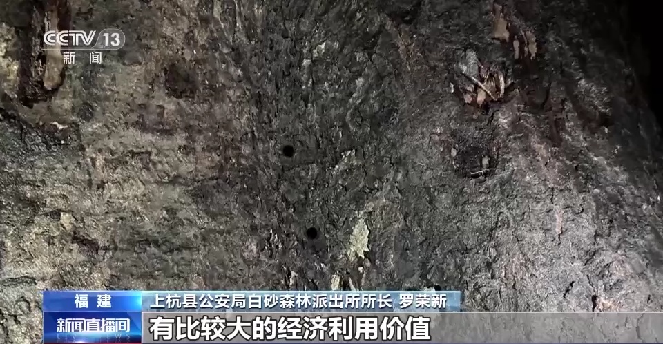 上杭县公安局白砂森林派出所所长 罗荣新:嫌疑人通过注射毒药致使古樟树死亡,这一类树木的木质部分会比较厚,有比较大的经济利用价值,可以获取比较大的非法利益。如果是自然枯死的古樟树,大部分空心比较严重,不具备再次利用的价值,它的社会经济价值也比较低。犯罪嫌疑人为了追求最大的经济价值,不惜以身犯险,以身触法。