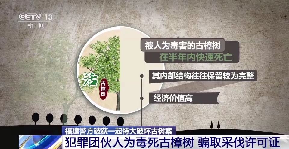 警方介绍,被人为毒害的古樟树在半年内快速死亡,其内部结构往往保留较为完整,经济价值高。古樟树枯死后,犯罪嫌疑人声称树木为自然死亡,骗取林业部门的采伐许可证,随后的采伐就被披上了“合法”的外衣。