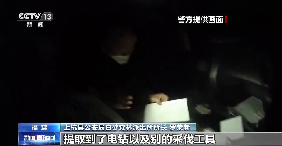 上杭县公安局白砂森林派出所所长 罗荣新:我们在犯罪嫌疑人的车辆后备箱提取到了电钻以及别的采伐工具,在犯罪嫌疑人的家里面,我们通过搜查发现了一大批有毒有害物质。