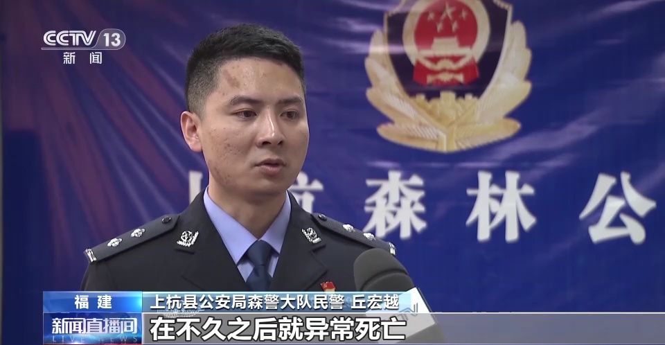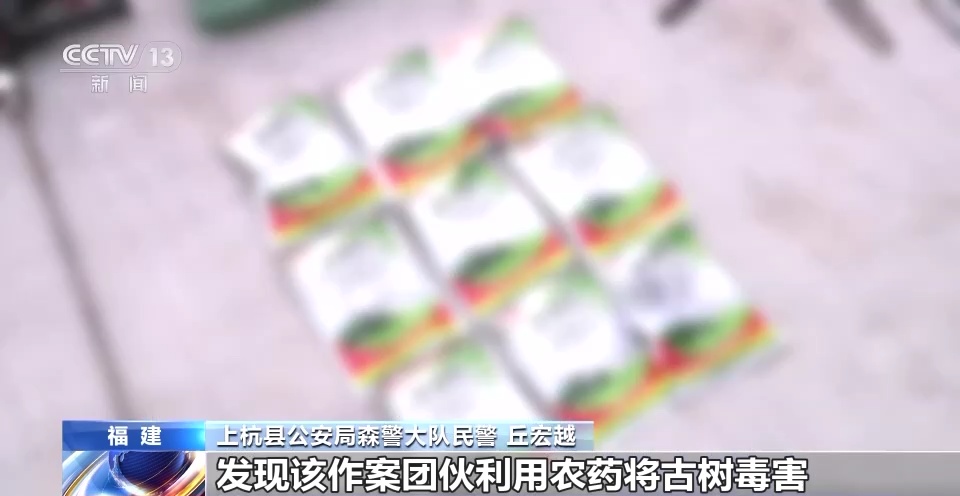 上杭县公安局森警大队民警 丘宏越:根据我们的调查,发现该作案团伙利用农药将古树毒害,并伪造古树自然死亡的现象。经过注射药品,这些古树大概3到6个月后会呈现枯死状态。