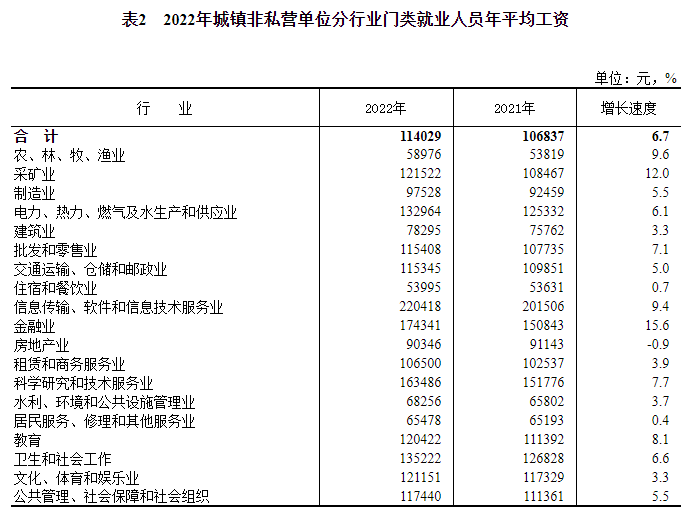 2022年全国城镇非私营单位就业人员年平均工资为114029元,比上年增加7192元,名义增长6.7%。扣除价格因素,2022年全国城镇非私营单位就业人员年平均工资实际增长4.6%。