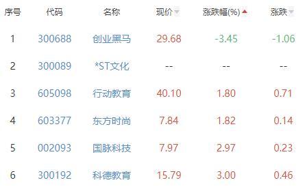创业黑马、行动教育、东方时尚、国脉科技、科德教育位列涨幅榜后五位,涨幅分别为-3.45%、1.80%、1.82%、2.97%、3.00%。