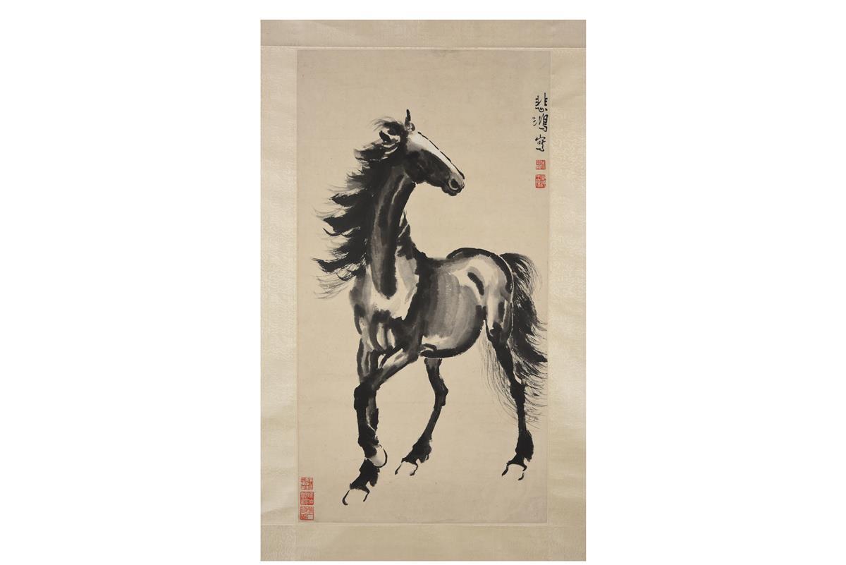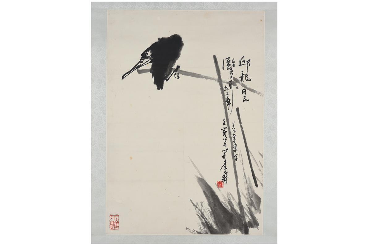 近现代书画作品除部分为重金购得外,多数由童邱龙通过书信、老战友等不同途径而求得,均有“邱龙同志正”“邱龙同志之属”等字。书画名家因敬重童老品格,相赠作品几乎件件精品。如,李苦禅的《荷花图》轴采用大写意手法,层次分明,对比强烈。与李苦禅并称“南潘北李”的潘天寿所作《鱼鹰图》轴简约豪放,布局奇特。徐悲鸿的《墨马图》轴笔下的奔马昂扬、奔放。