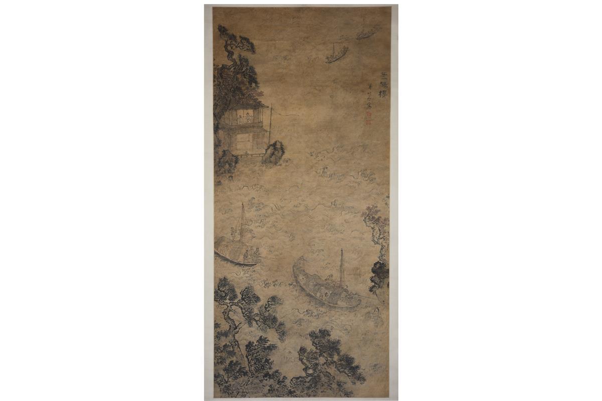 绘画作品中,明代谢时臣的《岳阳楼图》轴和清代黄鼎的《黄陵庙图》轴最为引人瞩目。谢时臣强调对文学修养和意趣等画外功夫的表达。对于岳阳楼这一江南名楼,他选择较为朴素自然、简略概括的处理方法,表现岳阳楼“衔远山,吞长江”的开阔意境和气势,使整幅作品展现的不仅是建筑的鬼斧神工、大自然的壮丽秀美,更有文人画家的气度胸襟。黄鼎为清代“娄东派”重要画家,此件国家一级文物《黄陵庙图》轴为其晚年作品,仿元代王蒙风格兼宋人笔意,描绘长江巫峡黄陵庙一段峰峦景致,远山近水尽收眼底。