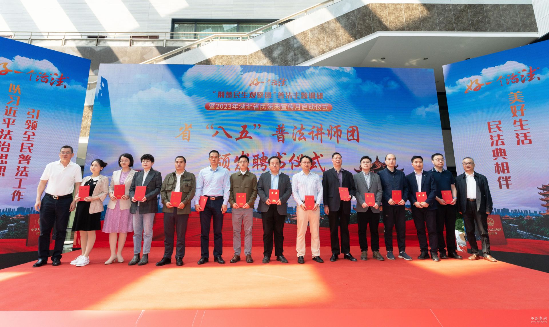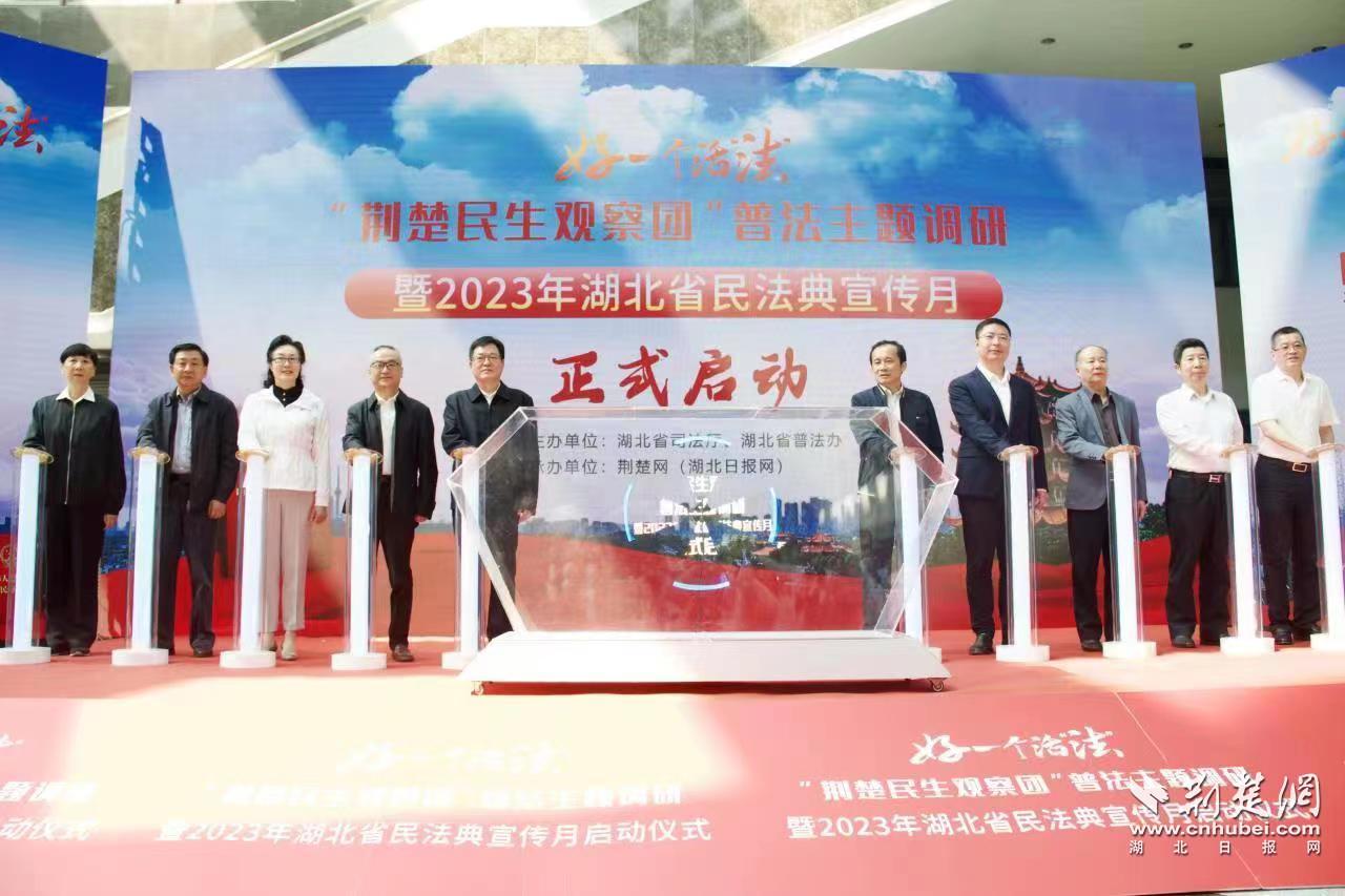 荆楚网(湖北日报网)讯(记者 邱玲鹏、周梦伊 通讯员 董亦男)5月12日上午,由湖北省司法厅、湖北省普法办主办,荆楚网(湖北日报网)承办的“好一个活‘法’——‘荆楚民生观察团’普法主题调研暨2023年湖北省民法典宣传月”启动仪式在楚天传媒大厦举行,这是深入开展学习贯彻习近平新时代中国特色社会主义思想主题教育的重要举措,也是湖北省民法典主题宣传月活动的具体实践。湖北省司法厅党委书记、厅长龚举文出席活动并讲话。