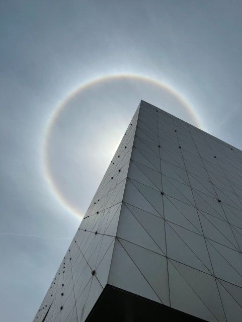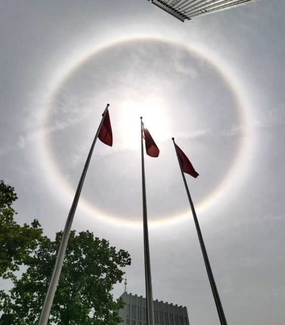 原来,这是罕见的日晕,又叫圆虹,是一种大气光学现象,是日光通过卷层云时,受到冰晶的折射或反射而形成的。当光线射入卷层云中的冰晶后,经过两次折射,分散成不同方向的各色光。