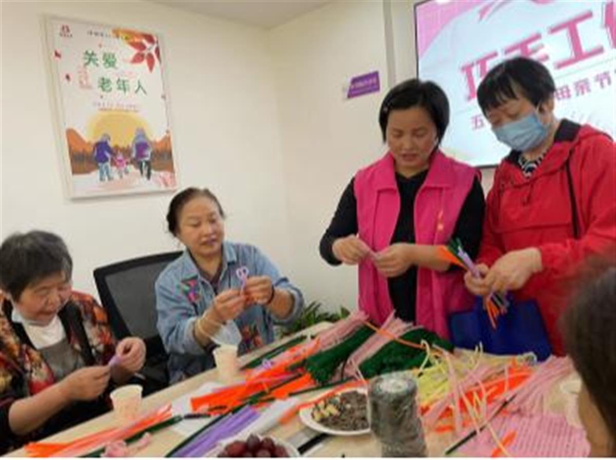“老师,这枝花按这个角度放可以吗?”“你看我给这朵花配圆形叶子好,还是长条叶子好?”在五里墩街道五瑞里社区,一件件别致的插花作品,都是志愿者与居民们一起DIY的。现场,妈妈们手捧插花载歌载舞,并互相拍照留念,脸上露出灿烂的笑容。