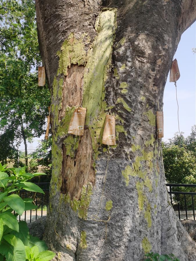 经专家会诊,古皂角树患上严重的“流腐病”。却波介绍,工作人员先锯掉干死树枝,避免其吸收有限的水分和营养,清除树干腐烂枯萎木质,用碘酒等杀菌杀虫防腐,对伤疤、树洞消毒后用水泥等填充。在树干5米外的地方,开挖二十厘米深的小沟,埋入有机肥,5米内区域翻松土层,撒入有机肥,25公斤重的有机肥埋了十几袋,以保证根系营养。为快速恢复古树体力,工作人员通过输液的方式给古树补充营养。记者现场看到,高高的树干上,挂着20个装有营养液的塑料袋,袋中液体顺着长长的输液管,不断注入树干。