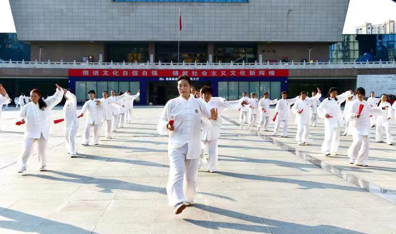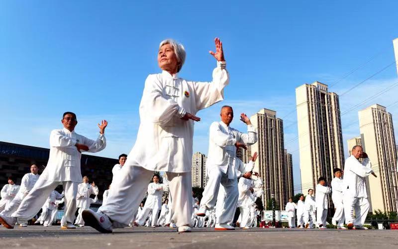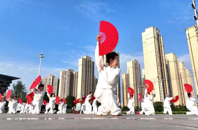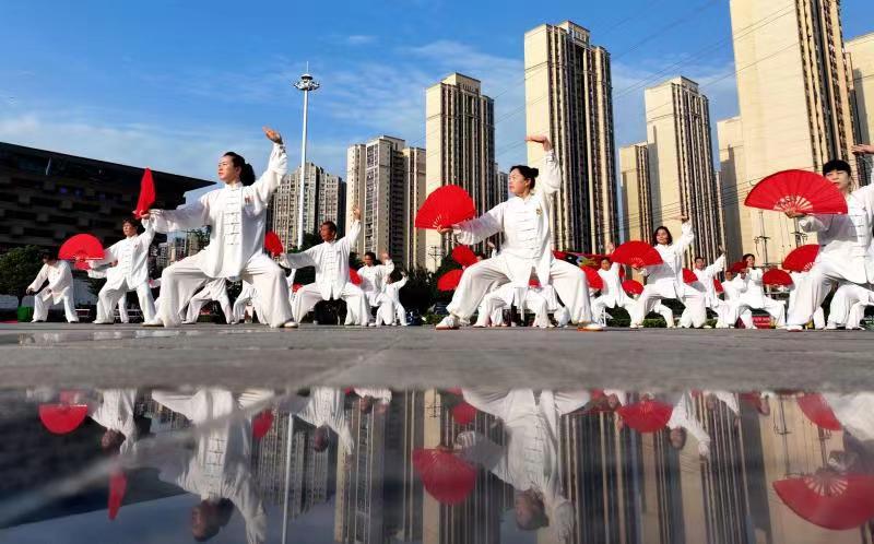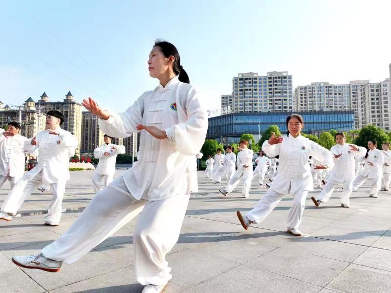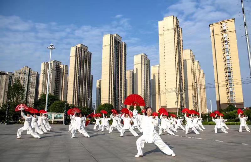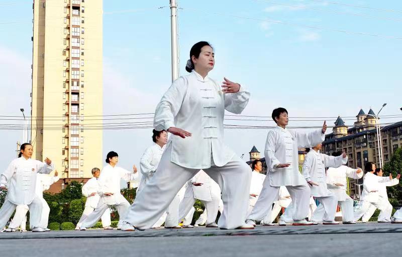 雨过天晴后,蓝天白云下的南漳县文化中心广场,迎来了该县健身气功协会的60多位中老年朋友们,他们用太极拳、太极扇等太极套路,描绘着出幸福的生活图景。