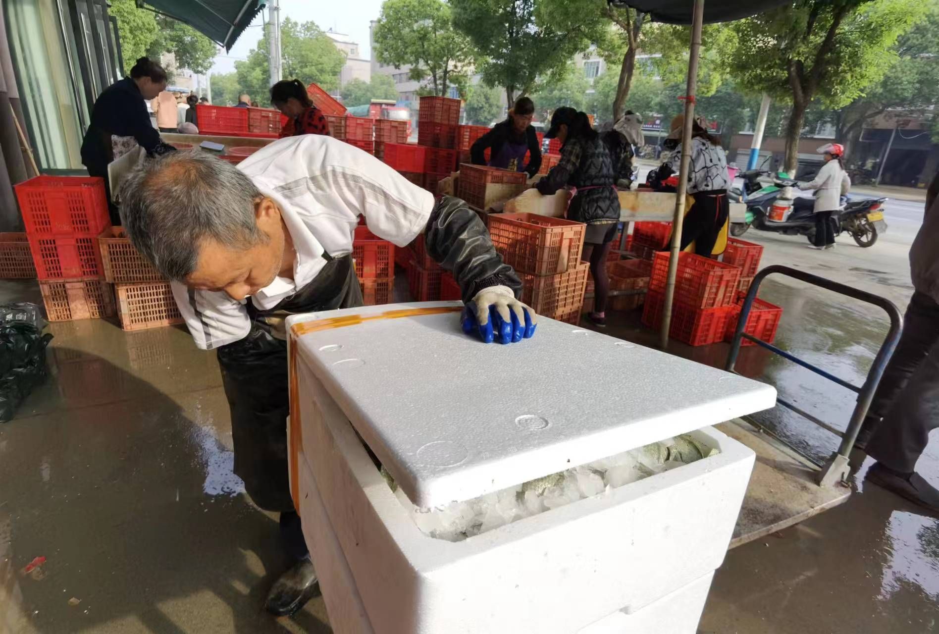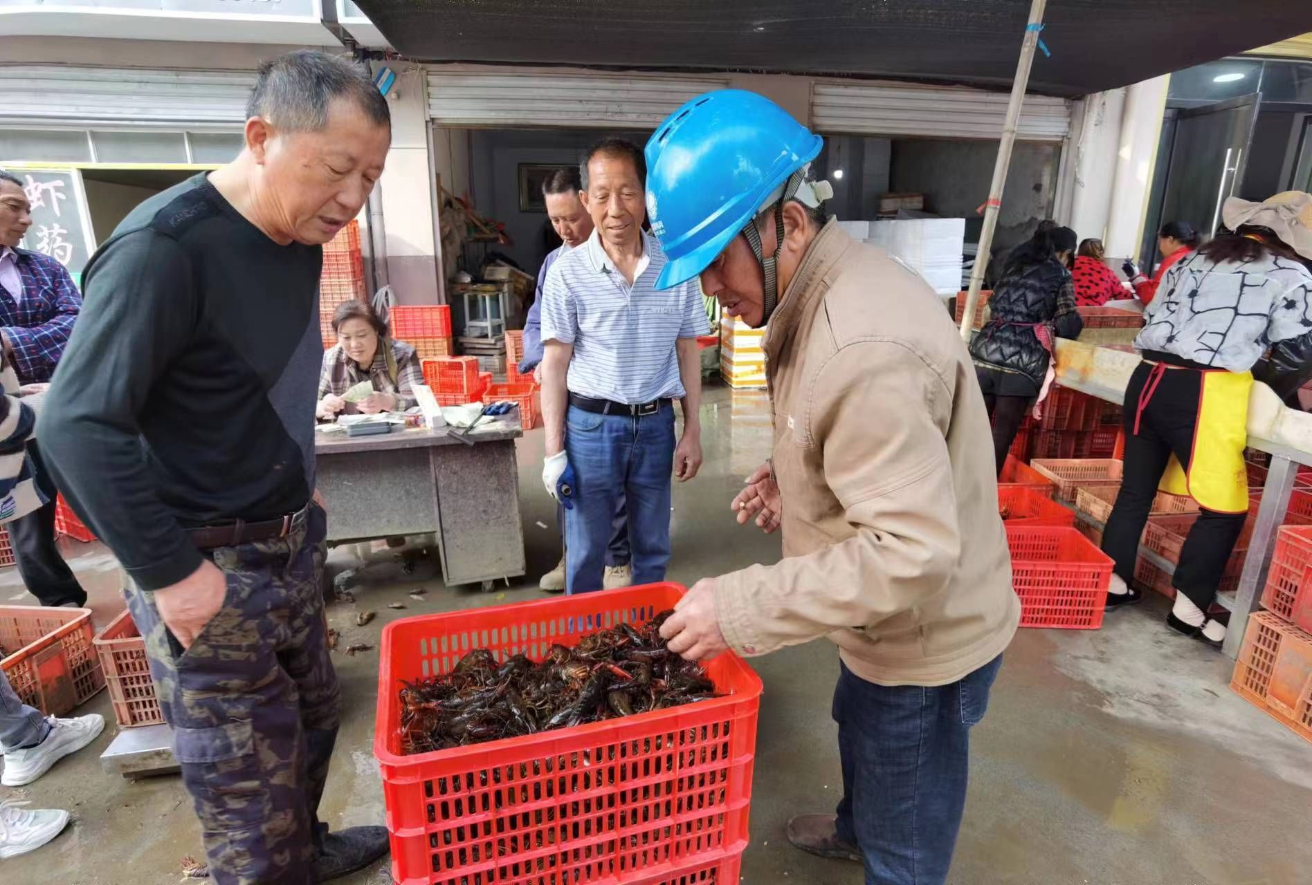 5月13日,在沙洋县高阳镇街头的水产品市场,来自该镇的养殖户正抓紧将收获的小龙虾新鲜出售。据当地农户介绍,仅小龙虾养殖一项,亩均可增收3000元以上。