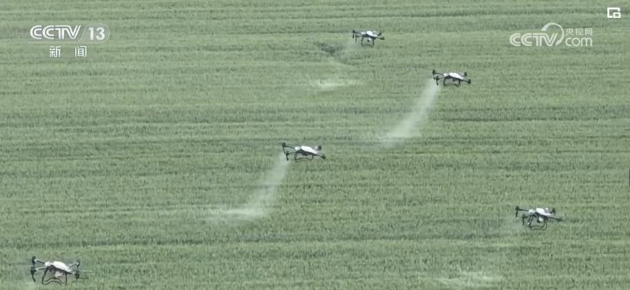 在运城河津市的小麦地里,10架无人机正在麦田上方进行喷洒作业。