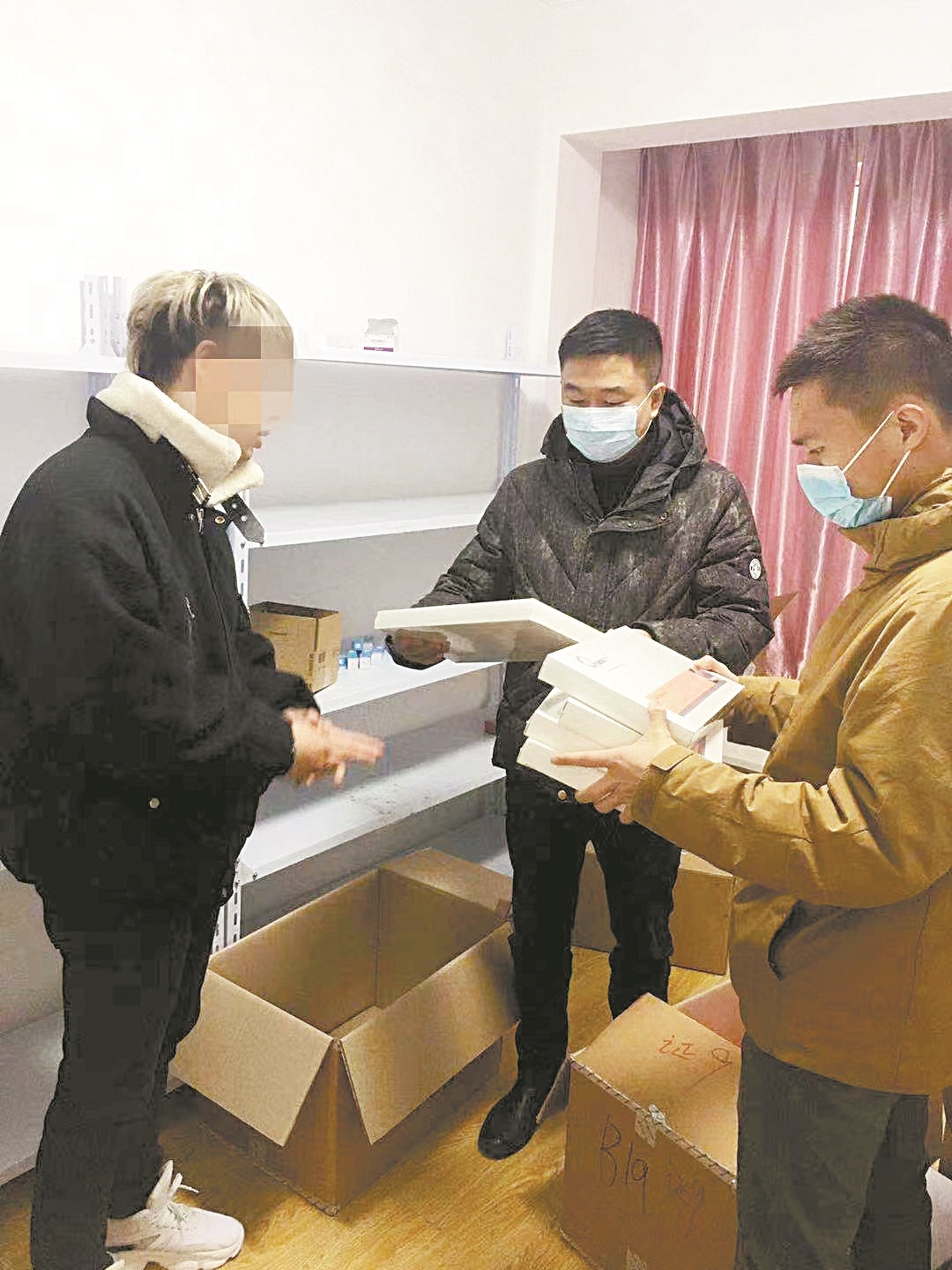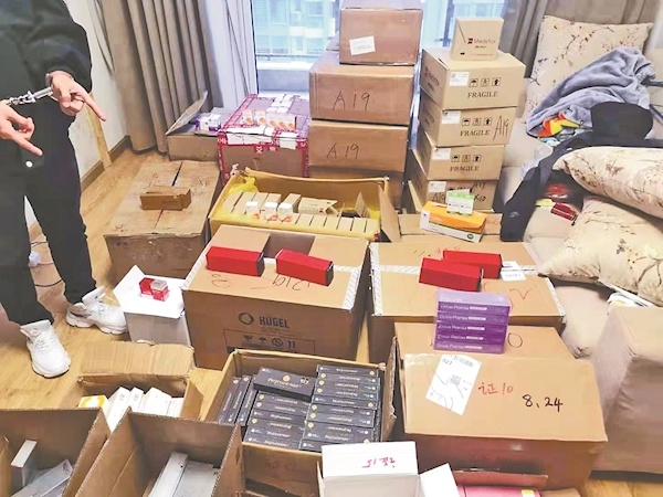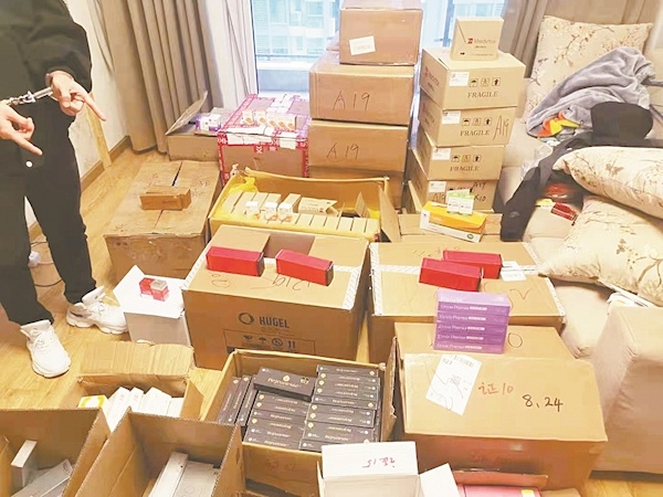 掌握余某、刘某的活动规律和犯罪证据后,2020年12月18日,江岸警方联合市场监管部门开展收网行动。上午,民警来到武昌区铁机路余某家门外,守候至下午1时许,趁余某给外卖员开门时,民警现身将余某控制。与此同时,另一路民警在江岸区汉黄路控制了刘某,随后搜查其存放美容产品的仓库,查获大量尚未销售的美容产品。