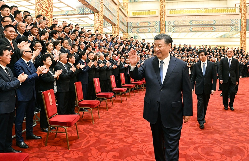 5月8日,党和国家领导人习近平、王沪宁、蔡奇等在北京人民大会堂会见第十届世界华侨华人社团联谊大会代表。新华社记者 李学仁 摄