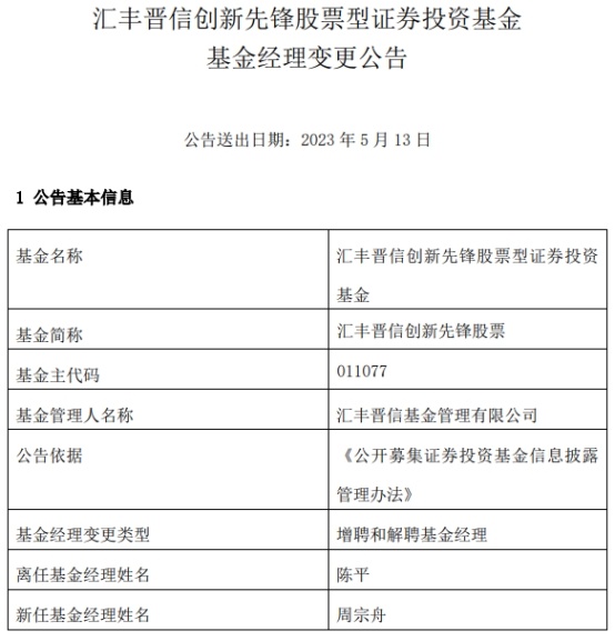 中国经济网北京5月15日讯 近日,汇丰晋信基金管理有限公司发布基金经理变更公告,汇丰晋信创新先锋股票(011077)增聘基金经理周宗舟,陈平离任。