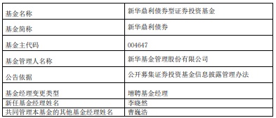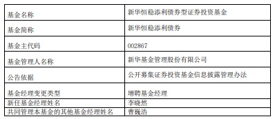 中国经济网北京5月15日讯 近日,新华基金管理股份有限公司发布基金经理变更公告,新华鼎利债券、新华恒稳添利债券增聘基金经理李晓然。