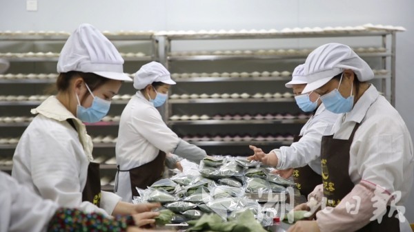 在恩施土得很食品有限公司生产车间内,工人们逐渐忙碌起来。这家位于翔凤镇老寨坪村的公司,主要生产米粑粑、苞谷粑粑、绿豆皮等来凤特产,没有实体店,完全依靠网络销售。