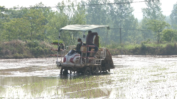 在大悟县城关镇枣棚村刘家塆,稻田里机声隆隆,旋耕机、打浆机、插秧机在不同田块里作业。在农机手熟练操作下,一盘盘秧苗均匀地插入田中,随风摇曳。据城关镇枣棚村党支部书记、村委会主任胡大锋介绍,村里外出务工人员比较多,很多粮田无人耕种,村委会主动引进种粮大户,流转村民土地种植水稻。