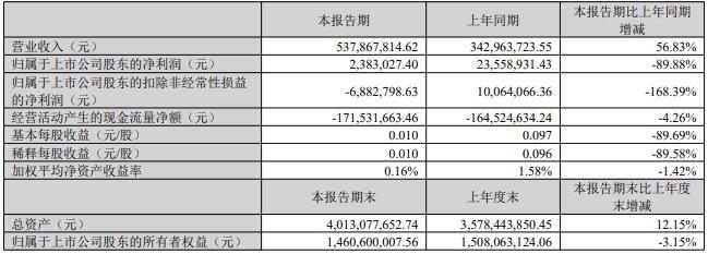 科大国创2023年第一季度报告显示,2023年一季度,科大国创实现营业收入5.38亿元,同比增长56.83%;归属于上市公司股东的净利润238.30万元,同比下滑89.88%;归属于上市公司股东的扣除非经常性损益的净利润-688.28万元,同比下滑168.39%;经营活动产生的现金流量净额-1.72亿元,同比下滑4.26%。