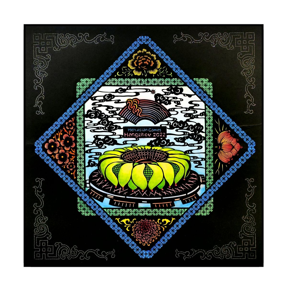 The "Big Lotus" (Hangzhou Olympic Sports Center Stadium) is central to the paper-cutting called Welcome to the Asian Games, along with the logo of the Games and propitious clouds. [Photo provided to chinadaily.com.cn]