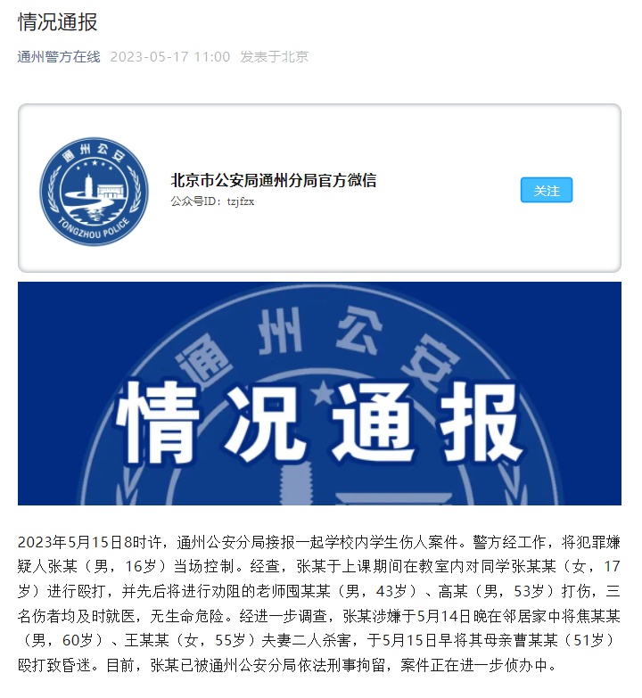 5月17日,北京通州警方发布情况通报:2023年5月15日8时许,通州公安分局接报一起学校内学生伤人案件。警方经工作,将犯罪嫌疑人张某(男,16岁)当场控制。经查,张某于上课期间在教室内对同学张某某(女,17岁)进行殴打,并先后将进行劝阻的老师囤某某(男,43岁)、高某(男,53岁)打伤,三名伤者均及时就医,无生命危险。经进一步调查,张某涉嫌于5月14日晚在邻居家中将焦某某(男,60岁)、王某某(女,55岁)夫妻二人杀害,于5月15日早将其母亲曹某某(51岁)殴打致昏迷。目前,张某已被通州公安分局依法刑事拘留,案件正在进一步侦办中。(总台央视记者 赵学荣)