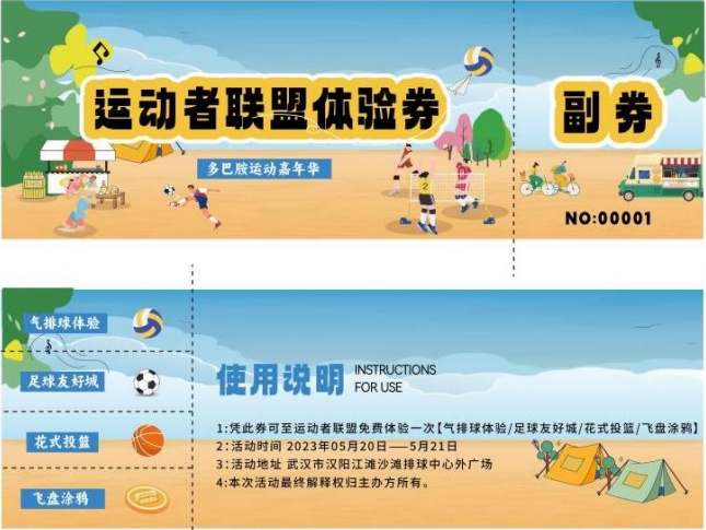 此外,还有运动者联盟体验券限量发放,游客凭券可在“运动者联盟”(互动游戏区)免费体验一次排球/足球/投篮/飞盘。
