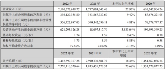 富瀚微2022年营业收入为21.11亿元,同比增长22.92%;归属于上市公司股东的净利润为3.98亿元,同比增长9.42%;归属于上市公司股东的扣除非经常性损益的净利润为3.57亿元,同比增长4.81%;经营活动产生的现金流量净额为6.21亿元,上年同期为-1809.75万元。