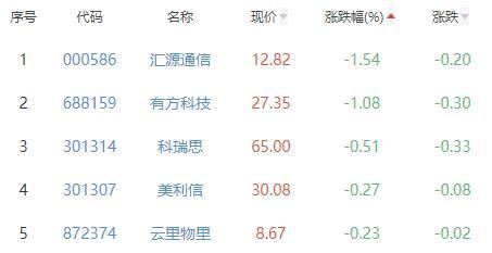 汇源通信、有方科技、科瑞思、美利信、云里物里位列涨幅榜后五位,涨幅分别为-1.54%、-1.08%、-0.51%、-0.27%、-0.23%。