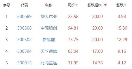 其中,澄天伟业、中际旭创、新易盛、天孚通信、兆龙互连位列板块涨幅前五位,涨幅分别为20.00%、20.00%、20.00%、17.00%、14.78%。