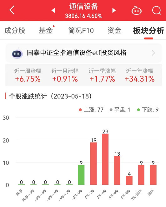 中国经济网北京5月18日讯 今日,通信设备板块整体涨幅4.60%,其中,77只股票上涨,1只股票平盘,9只股票下跌。