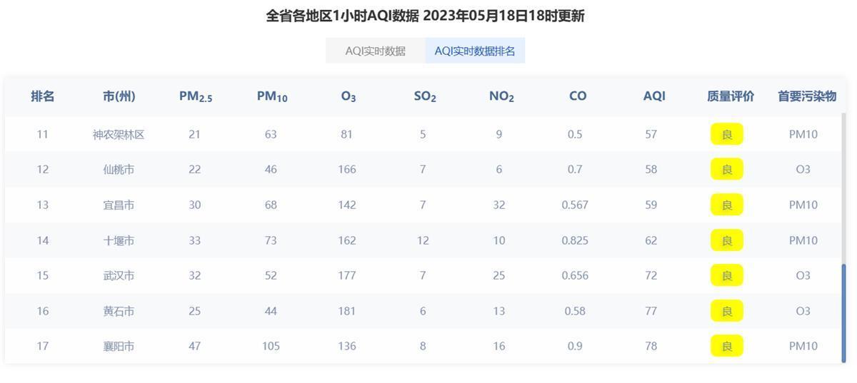 极目新闻记者注意到,5月17日,数据显示省内9个地市空气质量为良,其首要污染物均为臭氧,臭氧影响指数由小到大依次为天门、随州、恩施、神农架、十堰、宜昌、襄阳、荆门、荆州,最大数值为149。18日截至18时的数据显示,省内9个地市空气质量为良,其中4个地市的首要污染物均为臭氧,其余5个为PM10,臭氧数值最大的黄石市为181,武汉市为177,臭氧均超标。