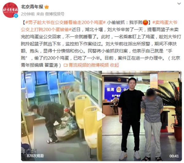 近日,湖北十堰,刘大爷辛苦了一天,提着两篮子未卖完的鸡蛋坐公交回家,不一会就睡着了。此时,一名乘客盯上了鸡蛋,趁刘大爷打盹拎起篮子就逃下车,监控拍下作案经过。刘大爷前往派出所报警,期间不停扶额、抱头,显得十分懊恼和伤心。民警将小偷抓获归案,他表示自己就是“手贱”,偷了约200个鸡蛋,已吃了一小半。目前,案件正在进一步办理中。