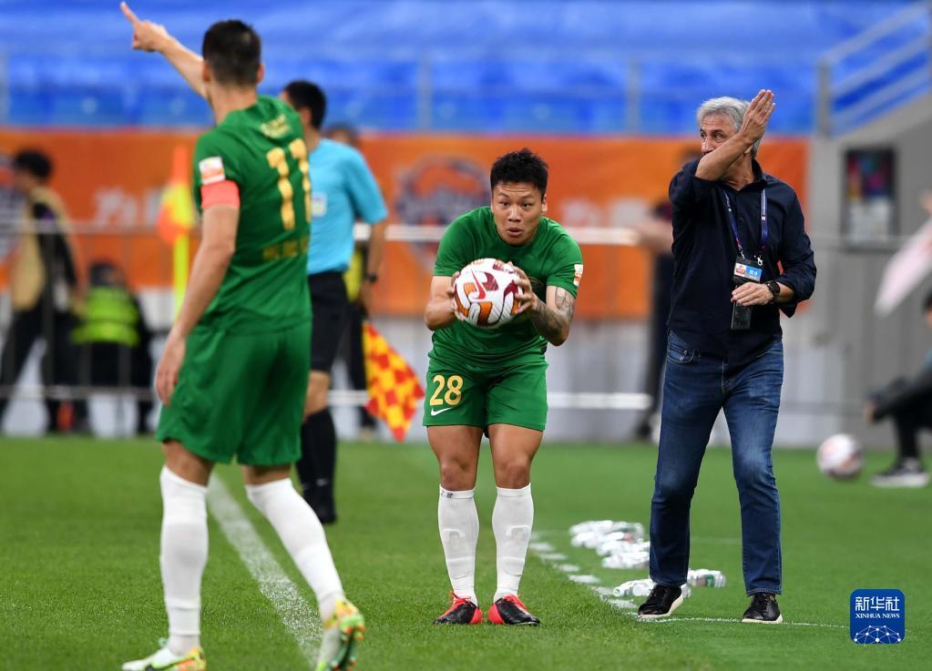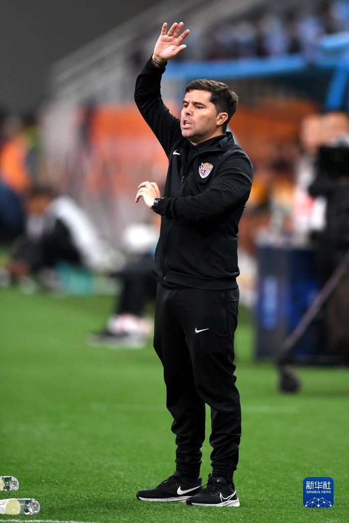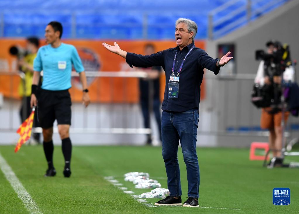 5月19日,青岛海牛队主教练戈麦斯在比赛中指挥。新华社记者 李紫恒 摄