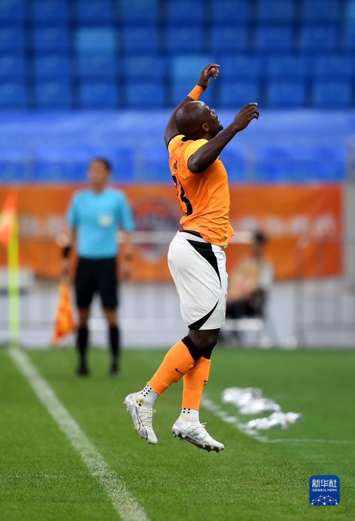 5月19日,青岛海牛队球员塔贝克在进球后庆祝。新华社记者 李紫恒 摄