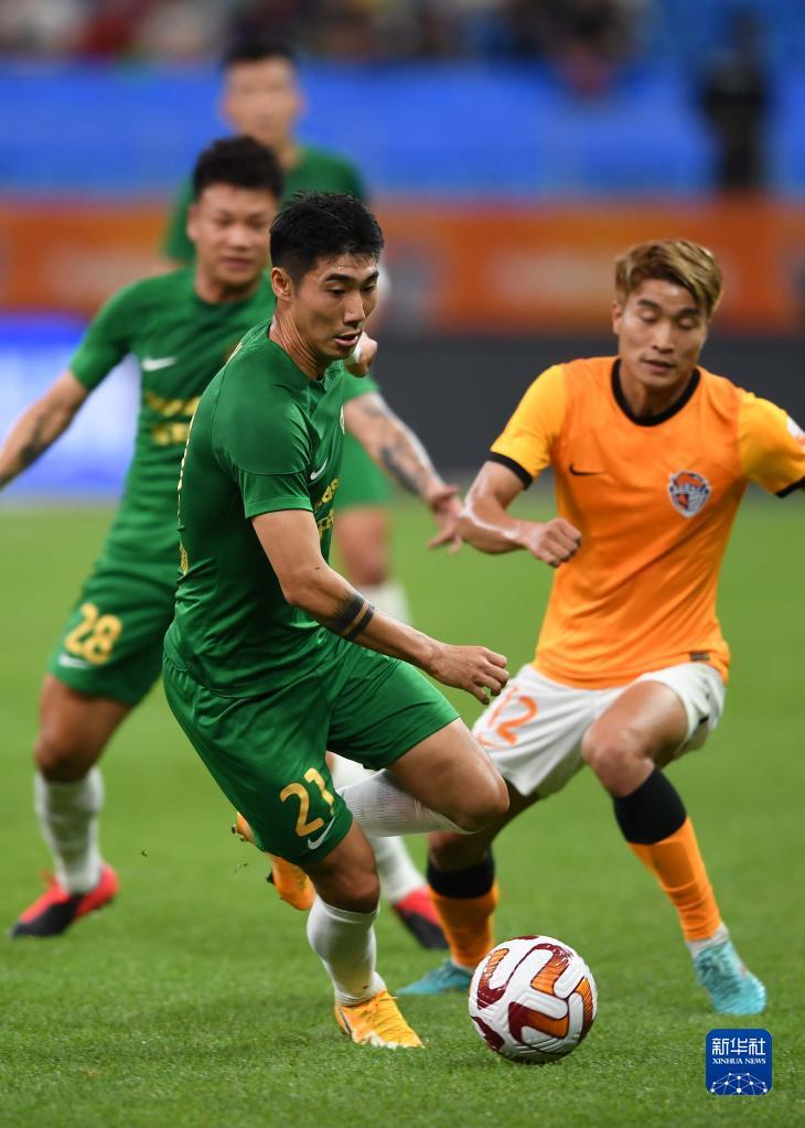 5月19日,青岛海牛队球员刘军帅(中)在比赛中拼抢。新华社记者 李紫恒 摄