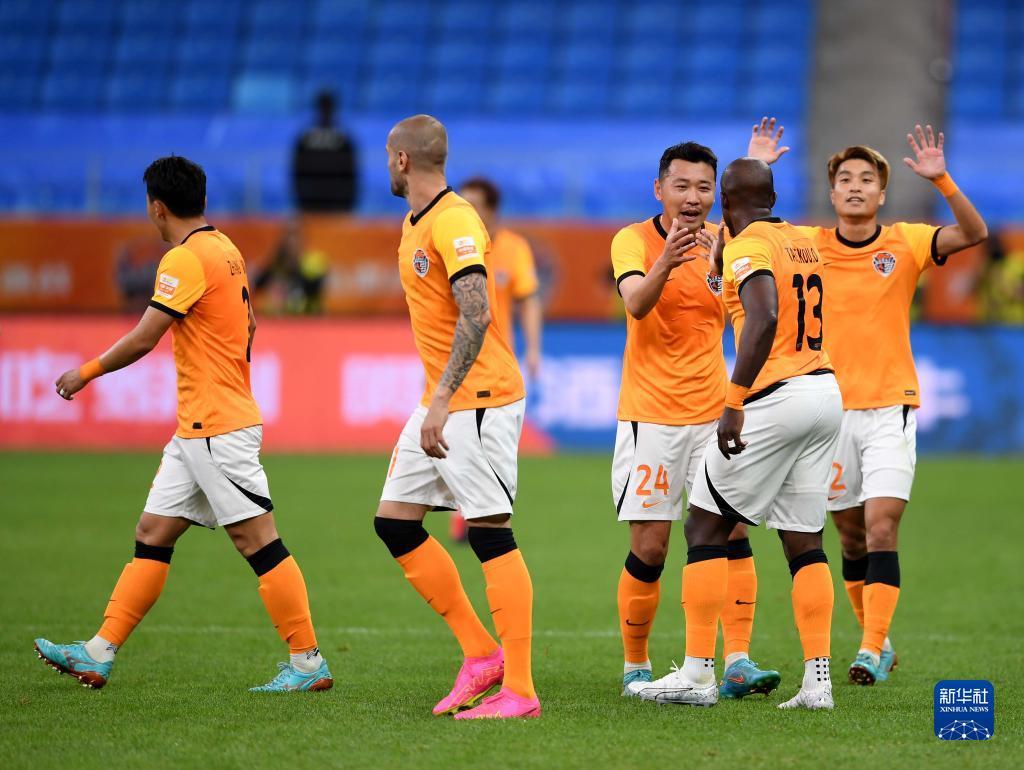 5月19日,青岛海牛队球员在进球后庆祝。新华社记者 李紫恒 摄