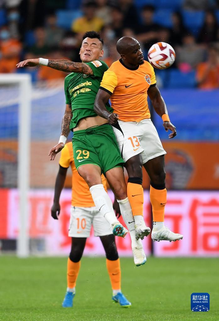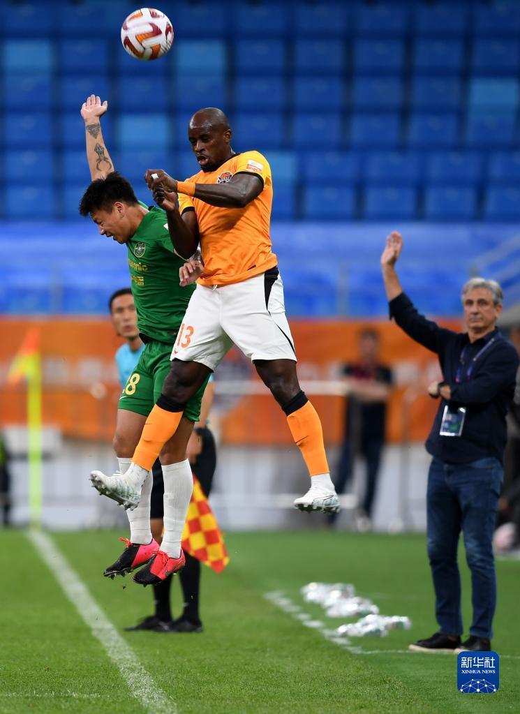 5月19日,青岛海牛队球员塔贝克(上右)在比赛中与浙江队球员岳鑫争顶。新华社记者 李紫恒 摄