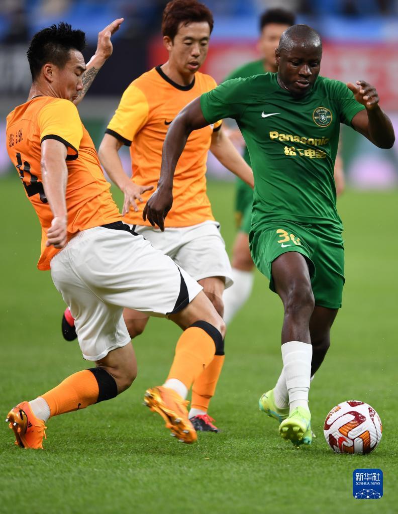 5月19日,青岛海牛队球员塔贝克(右)在比赛中与浙江队球员张佳祺拼抢。新华社记者 李紫恒 摄