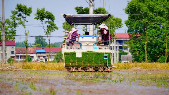 在城关镇临沮岗村的共享农场里,一盘盘绿油油的秧苗在育秧盘内茁壮生长。远处农田里,插秧机正在试验田里进行机插作业。机器上放满秧苗,还配备了为土地量身定做的缓释肥。随着插秧机的缓缓前行,一排排的秧苗整齐排列在田间,一粒粒缓释肥,也随着秧苗同步播撒在秧田里。田边,南漳县农技中心耕地质量与植物保护站站长魏遵龙正在向种植大户们讲解水稻测土施肥的好处。从肥料选取,到水稻减农药,再到缓释肥应用的优点。精彩的讲解赢得种植户的称赞。