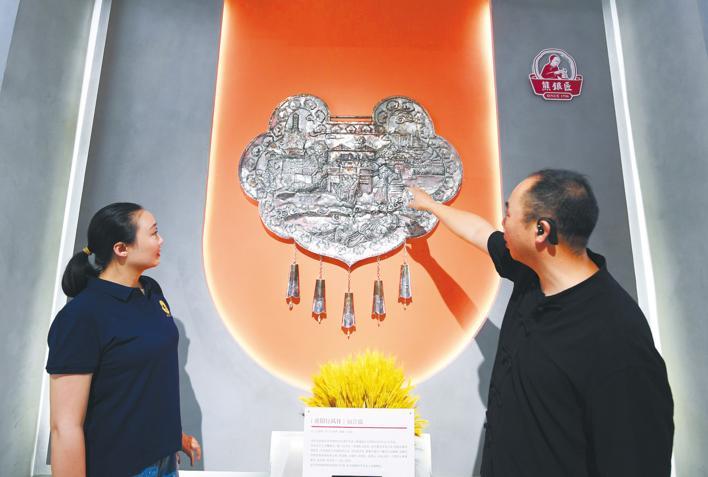 5月18日,襄阳市六零三文创园熊银匠银文化展览馆,非遗代表性传承人姚述宜(右)介绍手工银器的制作过程。