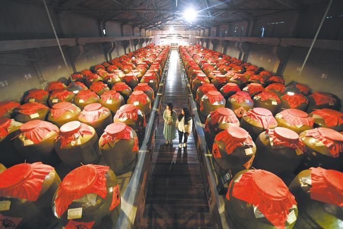 5月17日,游客在窖藏酒库了解石花酒业的发展历史、酿造工艺,感受霸王醉的独特魅力。