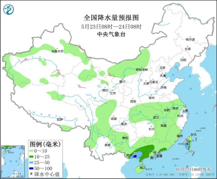 全国降水量预报图(5月22日08时-23日08时)