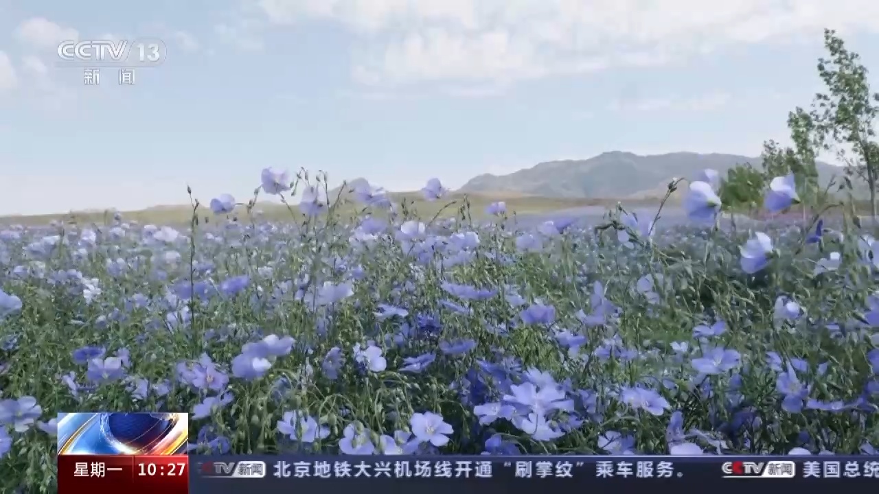 大家看我手里拿的这束花,除了芍药之外,还有蓝香芥、油菜花、大滨菊和亚麻花,它们都是天山花海这个季节盛开的花。这个亚麻花要特别给大家介绍一下,它非常神奇,每天上午开放,下午凋谢。除了花美观,亚麻籽可以榨出食用油,提取出来的亚麻纤维也是柔软耐磨,可以用来做高级服装。不仅是芍药和亚麻,当地还从薰衣草等花中提取香料、精油,通过花经济和农副产品深加工,结合休闲旅游打造农旅主题观光基地,天山花海每年收益可达近10亿元。