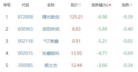 曙光数创、岳阳林纸、*ST紫鑫、协鑫能科、银之杰位列涨幅榜后五位,涨幅分别为-6.98%、-5.69%、-5.21%、-4.71%、-2.66%。