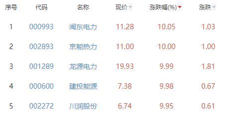 其中,闽东电力、京能热力、龙源电力、建投能源、川润股份位列板块涨幅前五位,涨幅分别为10.05%、10.00%、9.99%、9.98%、9.95%。