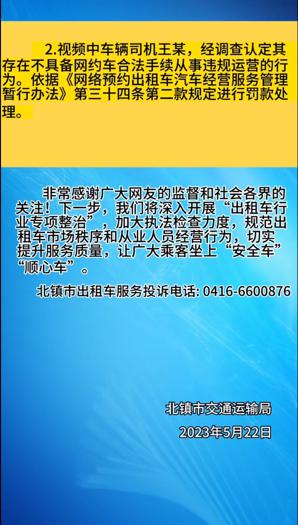 2.视频中车辆司机王某,经调查认定其存在不具备网约车合法手续从事违规运营的行为。依据《网络预约出租车汽车经营服务管理暂行办法》第三十四条第二款规定进行罚款处理。