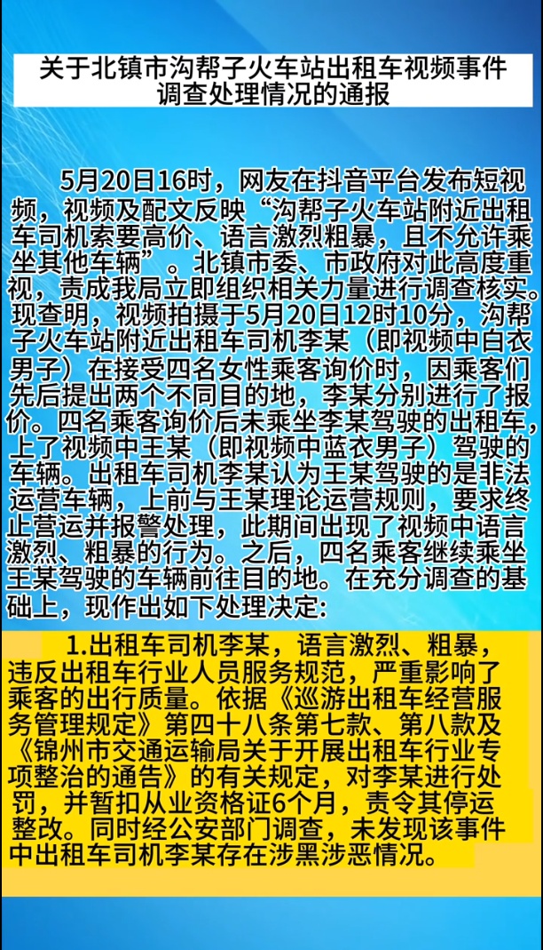 5月20日16时,网友在抖音平台发布短视频,视频及配文反映“沟帮子火车站附近出租车司机索要高价、语言激烈粗暴,且不允许乘坐其他车辆”。北镇市委、市政府对此高度重视,责成我局立即组织相关力量进行调查核实。现查明,视频拍摄于5月20日12时10分,沟帮子火车站附近出租车司机李某(即视频中白衣男子)在接受四名女性乘客询价时,因乘客们先后提出两个不同目的地,李某分别进行了报价。四名乘客询价后未乘坐李某驾驶的出租车,上了视频中王某(即视频中蓝衣男子)驾驶的车辆。出租车司机李某认为王某驾驶的是非法运营车辆,上前与王某理论运营规则,要求终止营运并报警处理,此期间出现了视频中语言激烈、粗暴的行为。之后,四名乘客继续乘坐王某驾驶的车辆前往目的地。在充分调查的基础上,现作出如下处理决定: