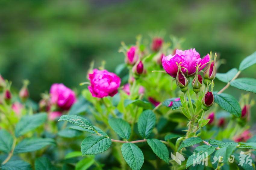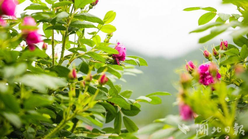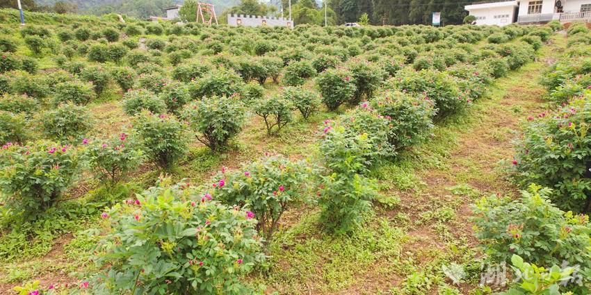 在朝阳寺镇五龙坪村群山环绕的田野间,连片的玫瑰花或含苞待放,或花开正艳,微风拂过,花枝摇摆,泛起阵阵花香,格外美丽灵动。