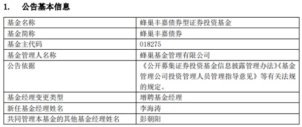 中国经济网北京5月23日讯 今日,蜂巢基金管理有限公司发布基金经理变更公告,蜂巢丰嘉债券(A类018275;C类018276)增聘基金经理李海涛。
